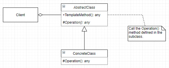 AbstractClass implements the shared code: the algorithm.ConcreteClass implements its specific part of the algorithm.Client calls...