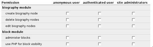 An implementation of hook_perm() simply returns an array of permission strings. Our implementation, biography_perm(), registers three new permissions: create biography node, edit biography nodes, and delete biography nodes.