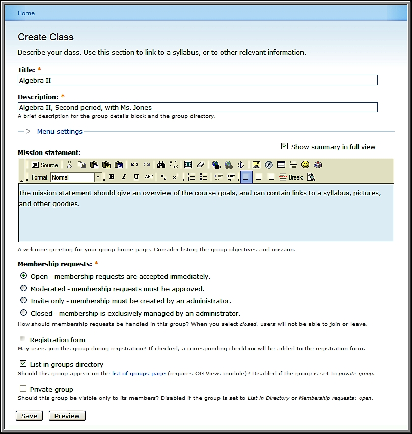 To create a group, click on the link created when you created the content type. If you created the custom menu as shown in the second screenshot under the Create a Menu for Groups, you will simply need to click the link for Class. If you did not create this custom menu, then the link will be available in the Create content menu as shown in the first screenshot under Create a Menu for Groups (refer to page number 258). In all cases, regardless of whether you have created a custom menu or not, you can create groups by navigating to node/add/[group-type].