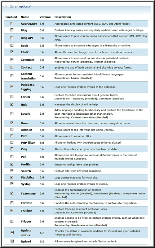In Chapter 3: Getting Started, we will look at the functionality of Core Drupal. In preparation for that section, we will look at the modules that come with core Drupal, and enable some of them.