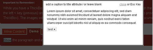 We can use ThickBox with images, content within iframes, and AJAX-based content. ThickBox also supports inline content (that is, content within the page that you are linking, as seen in the following screenshot), although this is not of interest to us in this application. Unlike Lightbox, ThickBox can also be used with Flash videos and games.