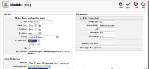 In Joomla!, there is one module called Random Images, mod_random_images. It reads the images of specified types from a specified directory and displays one image at a time. It's very simple! In order to use this module point to Extensions | Module Manager while logged in as an administrator to Joomla!. In the Module Manager screen, click on the module named Random Image. That opens the Module: [Edit] screen for the mod_random_image module as shown in the following screenshot: