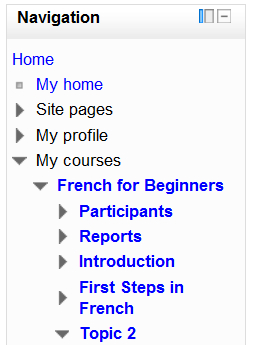 That's about it for the front page; let's click on that Courses link in the Navigation block now and head off to Stuart's French for Beginners course to look at it from a teacher's perspective. When Stuart accesses his own course, this is what he sees in the Navigation block, as shown in the following screenshot: