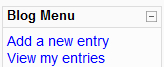 (She can also view her profile by clicking on her username as she could in Moodle 1.9). If she then clicks on Blogs she can view all the entries she made anywhere in Moodle and can also add a new entry: