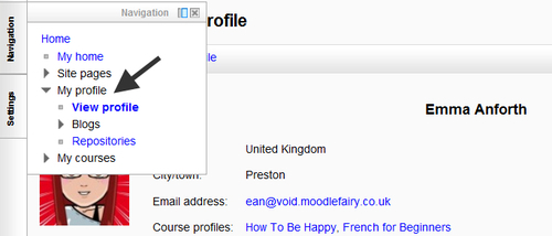 If we follow Emma into the Beginners' French course in Moodle 2.0, we see that she can access her profile from the navigation block by clicking on My profile and then selecting View Profile.
