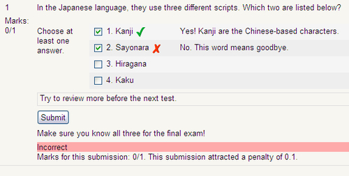 You can see all three feedback areas displayed here. Next to the answers, you can see the response feedback. This feedback is fairly useful, because it gives the correct meaning for each word. Under the responses, you can see the feedback for an incorrect response. "Trying to review more before the next test" might not be as useful as the concrete feedback given previously. Finally, under the Submit button...