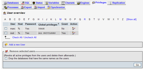The first page displayed when we enter the Privileges subpage is called User overview. This shows all user accounts and a summary of their global privileges, as shown in the next screenshot: