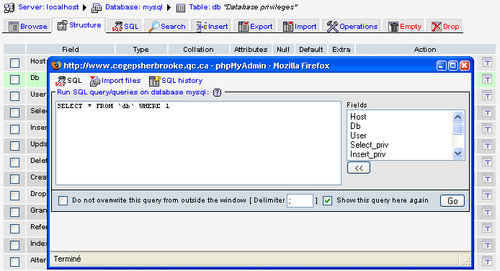 This link or icon is displayed if $cfg['QueryFrame'] is set to TRUE. A value of TRUE for $cfg['QueryFrameJS'] tells phpMyAdmin to open a distinct window and update it by using JavaScript commands; of course, this only works for a JavaScript-enabled browser. If this is set to FALSE, clicking on Query window will only open the main panel, and will display the normal SQL subpage.