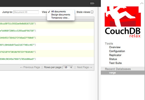 CouchDB provides temporary views for us to use when we are developing or trying to test the result of a view. Let's create a temporary view using Futon so that we can play with some of our data.