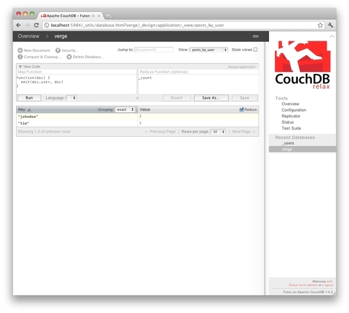 We just used Futon to update our view to use a _count reduce function. We then tested the reduce function in the same view by clicking on the Reduce checkbox. You'll notice that our reduce function also returned a key/value pair with the key equal to the username and...