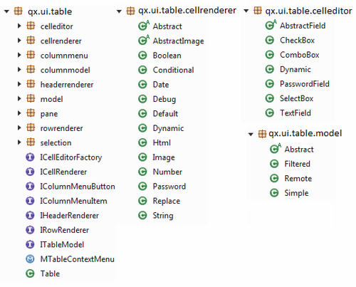 All the table-related classes are under the package qx.ui.table. The class hierarchy of the table classes is as follows: