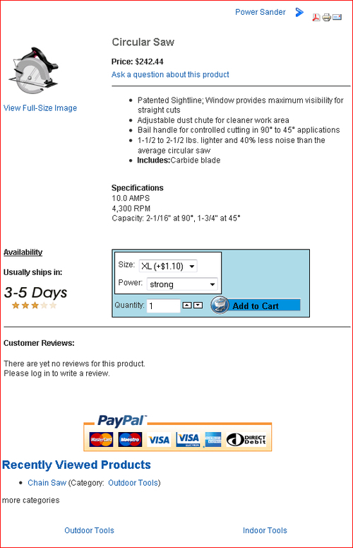 Footer—including the PayPal logo, recent products, related products, child categories, and so on