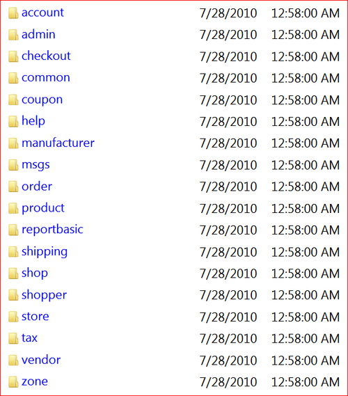 As you can see, all the 16 modules of VirtueMart have their own subdirectories. There are two additional subdirectories not corresponding to any module: common and msgs. The msgs language files are not actually used. The common subdirectory is used for storing common language elements, as explained further below.