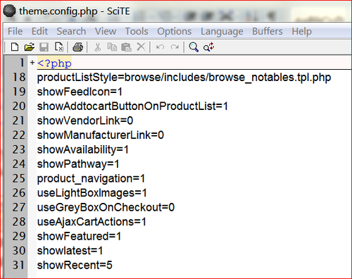 We have seen this page before in Chapter 2, The VirtueMart Default Theme, when we talked about the theme settings. When you save the settings, the data will be stored in the file theme.config.php, the content of which is shown in the following screenshot:
