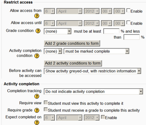 Conditional Activities is Moodle's fancy name for locking items down and only showing them to pupils under certain conditions. If your Moodle admin has enabled Conditional access along with Completion tracking, then at the end of each resource and activity we've set up, you will have noticed some settings like this: