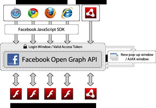 This next image outlines the major layers involved when communicating with Facebook, through the Facebook ActionScript 3 SDK, from a Flash Platform application. It doesn't comprehensively outline every interaction or capability of the platforms, but it should give you an overview of the elements involved.