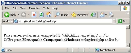 Looking at this error, you can see that on line 94 of the feed.php script (don’t worry if you don’t have this particular page yourself—it is a custom page used for this demo), the PHP interpreter expects to find a, or;, but instead it has come across something called a T_VARIABLE. A T_VARIABLE is simply PHP’s name for a variable defined in your script. So the English translation of this error is: