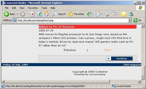 The above screenshot also highlights why it is so important to test everything thoroughly. Can you spot the problem? Well, the navigation links at the bottom of the feed page show that there is only one page, yet as you can clearly see, the Next button can still be activated, implying that there are more than ten items in the feed (the feed.php script is set to allow for ten results per page). This is a bit of a problem: either there are only ten items in the feed, in which case the Next button should not be active, or there are more than ten items in the feed, in which case there should be more than one page of feed items.