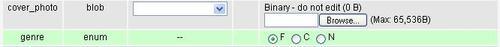We add a field named genre to the book table and define it as an ENUM. For now, we choose to put short codes in the value list and make one of them,'F', into the default value: